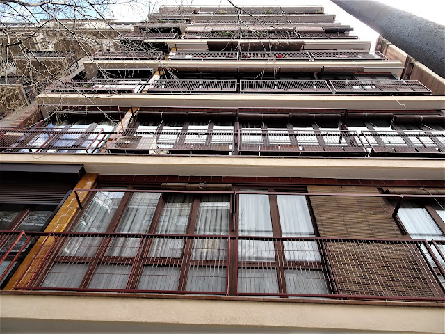 "Obra de los años 1962-66. El interés de este edificio radica en la originalidad de su disposición en planta y, al mismo tiempo, de la solución dada a la fachada. Esta se proyectó como una fachada típica de patio interior, con galerías de vidrio protegidas con persianas."