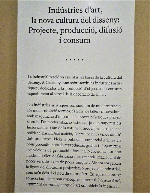 "La industrialización asentó las bases de la cultura del diseño. En Cataluña destacaron las industrias artísticas, dedicadas a la producción de objetos de consumo especialmente al servicio de la decoración del hogar. Las industrias artísticas son sinónimo de modernización. De modernización técnica, es decir, de talleres innovadores, con maquinaria de importación y nuevas prácticas profesionales. De modernización estética, puesto que superan los historicismos y convierten la naturaleza en su modelo principal, sin olvidar el pasado. Asimismo, se abre una nueva vía de difusión de los productos. Aparece la publicidad comercial gracias a los nuevos procedimientos de reproducción gráfica y se organizan exposiciones de promoción y fomento. Nace pues un nuevo modelo de taller, de fabricación y de comercialización, tanto de piezas seriadas como de piezas únicas. Al mismo tiempo surgen las figuras del dibujante proyectista o proyectista industrial, como se le denominaba, y el nuevo director de arte. En este contexto nace un nuevo concepto comercial, el objeto de arte, argumento de venta, porque el arte ennoblece a la industria."