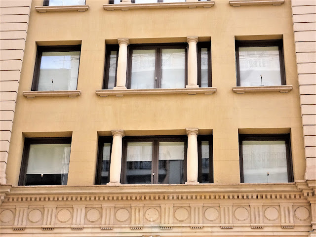 La fachada se estructura horizontalmente en tres ámbitos, de los cuales el central constituye la zona de oficinas y se trata con un lenguaje arquitectónico racionalista al estilo de la escuela de Chicago. Los niveles inferior y superior, en cambio, se expresan con mayor suntuosidad con la introducción de elementos de tipo clásico"
