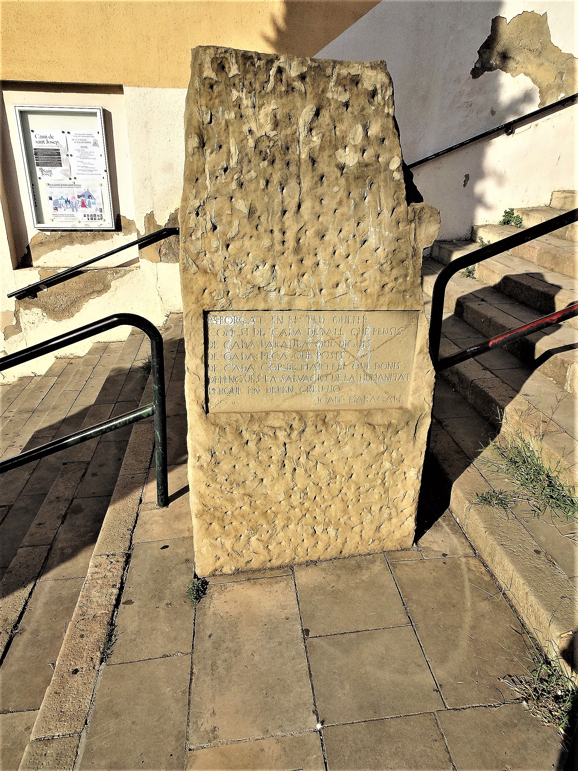 Monolito irregular con la inscripción mencionada que es un pensamiento de Joan Maragall. Está situada en la escalera de acceso a la iglesia de los Josepets.