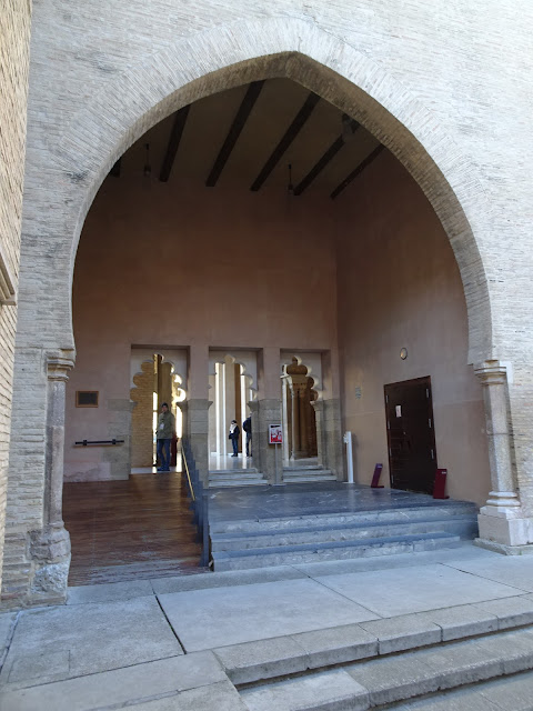 La arcada que se contempla mirando hacia el pórtico sur está restaurada mediante el vaciado de los arcos originales que están depositados en el Museo Arqueológico Nacional de Madrid y en el Museo de Zaragoza, los cuales debido a su mal estado de conservación, se cree que no podrán ser devueltos a su lugar de origen (Beltrán, A. (1970). La Aljafería. Ayuntamiento de Zaragoza). Suponen el mayor atrevimiento y distancia por su innovación con respecto a los modelos califales de las arquerías del lado norte.