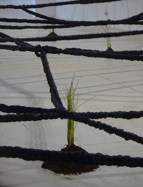 "El trenzado del cabello entre las mujeres africanas atrapadas en la trata de esclavos de la ruta Atlántica puede considerarse una práctica de resistencia. Más que con un ánimo ornamental, se sabe que las mujeres esclavizadas se trenzaban en el pelo rutas de escape (caminos hacia la libertad). Además, para estas mujeres el trenzado del cabello era también una forma de mantener el vínculo con su tierra natal. Antes de ser trasladadas a la fuerza a América, tejían arroz en sus mechones, una discreta práctica de almacenamiento surgida de la coacción y un símbolo de resistencia contra la esclavitud. De este modo llevaban consigo un trozo de su hogar y lo plantaban a su llegada al llamado «nuevo mundo». La artista ítalo-senegalesa Binta Diaw ha invocado esta tradición mediante su monumental instalación, para la que ha invitado a miembros de la diáspora africana de L'Hospitalet de Llobregat a tejer largas trenzas de pelo sintético. Mientras tejían, las personas participantes compartieron historias personales del pasado y del presente, y cultivaron la solidaridad entre ellas. La evocación de esta tradición por parte de Diaw sirve para centrar la atención en las experiencias afrodiaspóricas y feministas en Cataluña e invitar a la reflexión sobre cómo se representan e interpretan los cuerpos femeninos negros. "